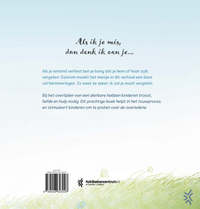 ‘Ik wil je nooit vergeten’ is een troostrijk prentenboek voor kinderen die een dierbare verloren hebben. Een jong meisje heeft iemand verloren van wie ze heel veel houdt. Ze maakt een doos waarin ze momenten en herinneringen verzamelt, en ze vertelt over hoe ze zicht voelt. Achterin het boek vind je meer informatie en tips om kinderen verder te helpen in hun rouwproces. Dit prentenboek maakt rouw bespreekbaar en helpt om het gesprek met kinderen aan te gaan. Door het unieke perspectief is het een universeel verhaal, dat gelezen kan worden bij het overlijden van een vriend, familielid of zelfs een huisdier.