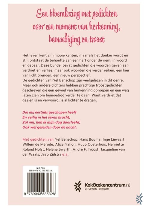 De bloemlezing ‘Ik wou zo graag dat ik wat troost kon geven’ bevat de mooiste troostgedichten uit het werk van Nel Benschop, Henriette Roland Holst, Jacqueline van der Waals, Jaap Zijlstra, Inge Lievaart en andere dichters. Want het leven kent zijn mooie kanten, maar als het donker wordt en stil, ontstaat de behoefte aan een hart onder de riem, in woord en gebaar. Dit boek bevat gedichten die woorden geven aan verdriet en verlies, maar ook woorden die verder reiken, een kier van licht brengen, een nieuw perspectief.