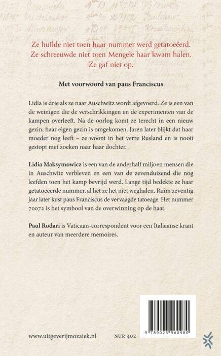 Ruim zeventig jaar later kust paus Fransicus de tatoeage en schrijft hij het voorwoord voor dit boek. Het nummer 70072 werd het symbool van de overwinning op de haat.