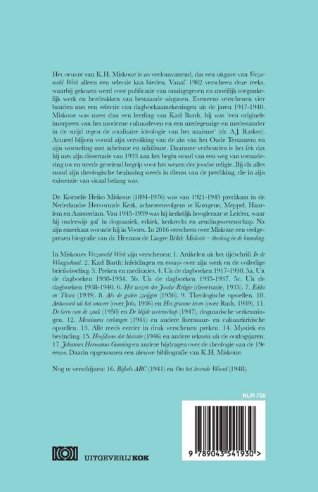 Dr. Kornelis Heiko Miskotte (1894-1976) was van 1921-1945 predikant in de Nederlands Hervormde Kerk, achtereenvolgens te Kortgene, Meppel, Haarlem en Amsterdam. Van 1945-1959 was hij kerkelijk hoogleraar te Leiden, waar hij onderwijs gaf in dogmatiek, ethiek, kerkrecht en zendingswetenschap. Na zijn emiritaat woonde hij in Voorst.