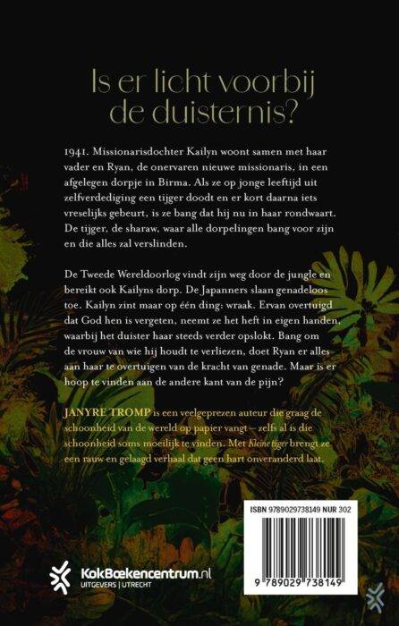 In 'Kleine tijger' neemt Janyre Tromp je mee naar het oerwoud van Birma, het huidige Myanmar, ten tijde van de Tweede Wereldoorlog. Als Japan het land binnenvalt, staat de missionarisdochter Kailyn Moran er zo goed als alleen voor. Haar vader is op reis, haar moeder is overleden en haar enige metgezel is Ryan McDonough, de onervaren nieuwe missionaris. Samen doen ze hun best hun dorp zo goed mogelijk te beschermen tegen de vijand.