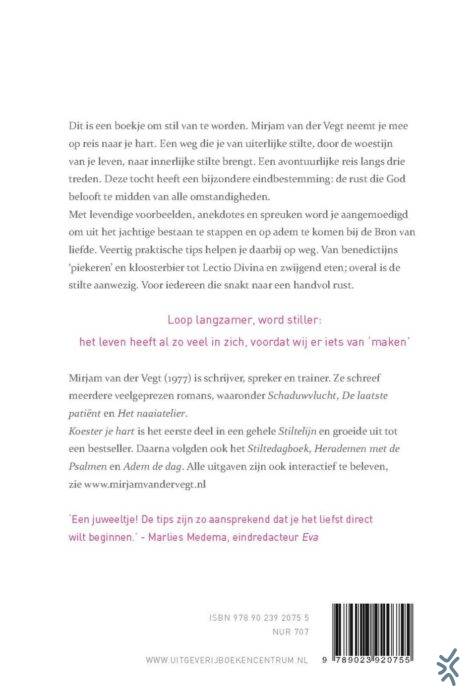 Dat is een weg die je van uiterlijke stilte, door de woestijn van je leven, naar innerlijke stilte brengt. Een avontuurlijke reis langs drie treden. Deze tocht heeft een bijzondere eindbestemming: de rust die God belooft te midden van alle omstandigheden. Met levendige voorbeelden, anekdotes en spreuken word je aangemoedigd om uit het jachtige bestaan te stappen en op adem te komen bij de Bron van liefde. Veertig praktische tips helpen je daarbij op weg. Van benedictijns `piekeren en kloosterbier tot lectio divina en zwijgend vasten; overal is de stilte aanwezig. Voor iedereen die snakt naar een handvol rust.