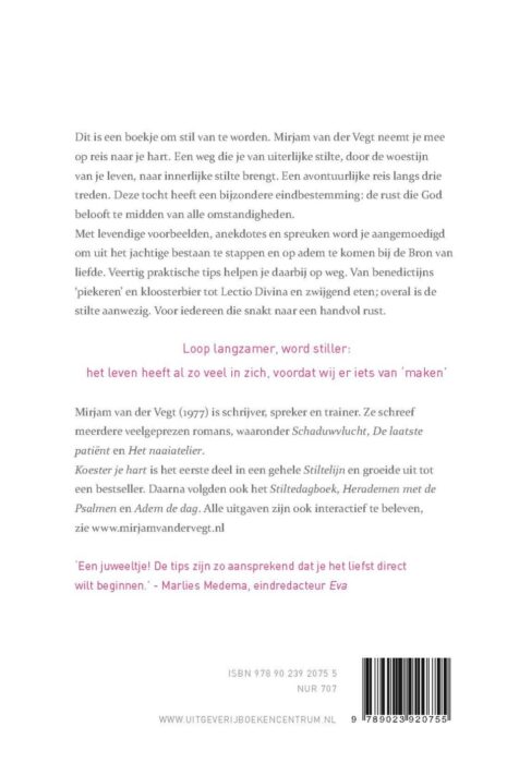 Koester je hart. 40 stiltetips voor je leven van Mirjam van der Vegt is een stilteboek dat de lezer meeneemt op weg naar de stilte. Deze tocht heeft een bijzondere eindbestemming: de rust die God belooft te midden van alle omstandigheden. Met levendige voorbeelden, anekdotes en spreuken word je aangemoedigd uit je jachtige bestaan te stappen en op adem te komen. Veertig praktische helpen je daarbij op weg: van benedictijns ‘piekeren’ tot Lectio Divina. Van de eerdere uitgave werden vele duizenden exemplaren verkocht.