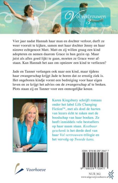 ‘Kostbaar geschenk’ van Karen Kingsbury: een roman verlies en zegeningen. Vier jaar geleden nadat Hannah haar man en dochter verloor, durft ze weer vooruit te kijken samen met haar dochter Jenny en haar nieuwe echtgenoot Matt. Matt en zij willen graag een kind adopteren en nemen daarom Grace in hun gezin op. Maar juist als alles goed lijkt te gaan, moeten ze Grace weer afstaan. Kan Hannah het aan om opnieuw een kind te verliezen? Jade en Tanner verlangen ook naar een kind, maar tijdens haar zwangerschap krijgt Jade te horen dat ze ernstig ziek is. Het ongeboren kindje vormt een bedreiging voor haar eigen leven. Ze krijgt het advies om de zwangerschap af te breken. ‘Kostbaar geschenk’ is het derde en laatste deel van de Vol vertrouwen-trilogie. De eerdere delen zijn ‘Wachten op de morgen’ en ‘Tweede kans’.