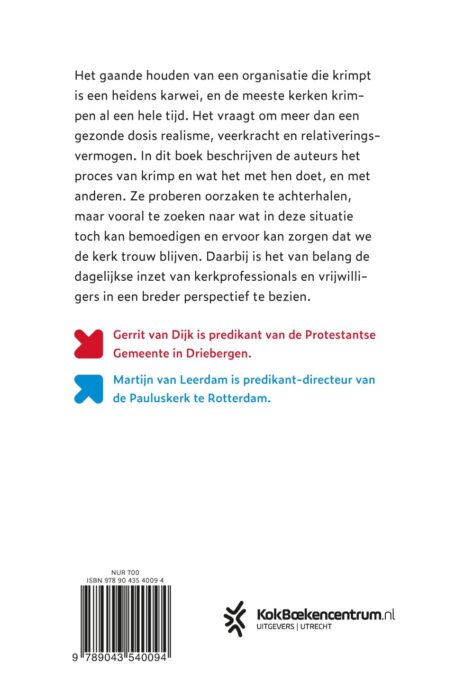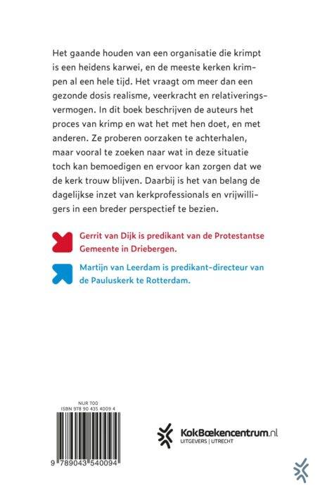 KRIMP is een inspirerend en praktisch boek waarin predikanten Gerrit van Dijk en Martijn van Leerdam het proces van krimp in de kerk beschrijven en reflecteren op wat het met hen en met anderen doet. De kerk is een organisatie die al vele jaren krimpt, en het gaande houden van een organisatie die krimpt is een heidens karwei. Het vraagt om meer dan een gezonde dosis realisme, veerkracht en relativeringsvermogen. In dit boek proberen de auteurs oorzaken te achterhalen, maar vooral te zoeken naar wat in deze situatie toch kan bemoedigen en ervoor kan zorgen dat we de kerk trouw blijven. Daarbij is het van belang de dagelijkse inzet van kerkprofessionals en vrijwilligers in een breder perspectief te bezien.