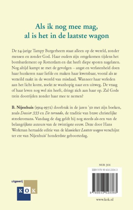 `Laatste wagon is misschien wel de mooiste roman die B. Nijenhuis heeft geschreven. Ter ere van zijn honderdste geboortejaar hertaalde zijn biograaf Hans Werkman dit bijzondere verhaal. De 24-jarige Tampy Burgerheem staat alleen op de wereld, zonder mensen, zonder God. Haar ouders zijn omgekomen tijdens het bombardement op Rotterdam. Angst en verlatenheid doen haar hunkeren naar liefde en maken haar kwetsbaar, vooral als zij verzeild raakt in de wereld van misdaad. Het brengt haar tot de wanhopige vraag of haar leven nog wel zin heeft. Zal Gods trein doorrijden zonder haar mee te nemen? B. Nijenhuis (1914-1972) doorbrak in de jaren 50 met zijn boeken, zoals `Dossier 333 en `De tornado , de traditie van brave christelijke streekromans. Vandaag de dag geldt hij nog steeds als een van de belangrijkste auteurs van de twintigste eeuw.