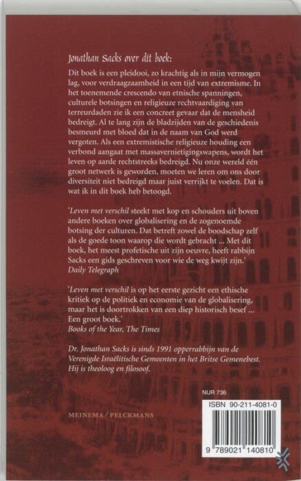 Dit boek is een pleidooi, zo krachtig als in mijn vermogen lag, voor verdraagzaamheid in een tijd van extremisme. In het toenemende crescendo van etnische spanningen, culturele botsingen en religieuze rechtvaardiging van terreurdaden zie ik een concreet gevaar dat de mensheid bedreigt. Al te lang zijn de bladzijden van de geschiedenis besmeurd met bloed dat in de naam van God werd vergoten. Als een extremistische religieuze houding een verbond aangaat met massavernietigingswapens, wordt het leven op aarde rechtstreeks bedreigd. Nu onze wereld één groot netwerk is geworden, moeten we leren om ons door diversiteit niet bedreigd maar juist verrijkt te voelen. Dat is wat ik in dit boek heb betoogd. 'Leven met verschil steekt met kop en schouders uit boven andere boeken over globalisering en de zogenoemde botsing der culturen. Dat betreft zowel de boodschap zelf als de goede toon waarop die wordt gebracht ... Met dit boek, het meest profetische uit zijn oeuvre, heeft rabbijn Sacks een gids geschreven voor wie de weg kwijt zijn.' Daily Telegraph 'Leven met verschil is op het eerste gezicht een ethische kritiek op de politiek en economie van de globalisering, maar het is doortrokken van een diep historisch besef ... Een groot boek, al telt het slechts 200 pagina's.' Books of the Year, The Times