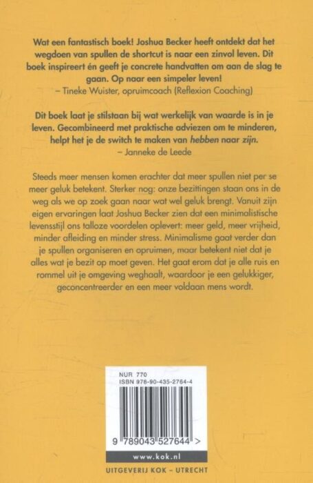 'Meer door minder' is een inspirerend boek van Joshua Becker over het creëren van ruimte in je huis, je leven, je hoofd en je bezit. Becker laat zien dat een minimalistische levensstijl geworteld is in eeuwenoude theorieën en methodes over afstand doen van bezit. Door alle ruis en rommel uit zijn omgeving weg te halen, is Becker een gelukkiger, geconcentreerder en een meer tevreden mens geworden. Het opruimen van alles wat overbodig is geeft letterlijk en figuurlijk ruimte in je leven!