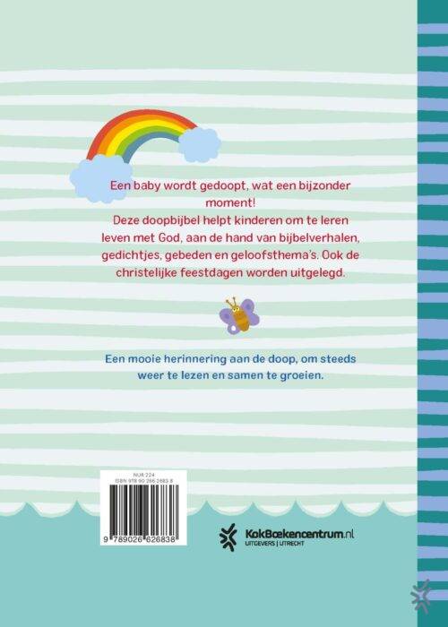 Een baby wordt gedoopt, wat een bijzonder moment! Er zijn in het leven van alledag veel momenten om over God te vertellen en zijn aanwezigheid te zien. Deze doopbijbel neemt kinderen mee in de wereld van het christelijk geloof, aan de hand van alledaagse situaties en meer dan twintig bijbelverhalen. Lees bijvoorbeeld over Noach en de regenboog, de tien geboden en de verloren zoon. Ook de christelijke feestdagen worden uitgelegd aan jonge kinderen.