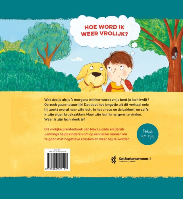 In het prentenboek ‘Mijn lach is kwijt’ vertelt Max Lucado het verhaal van een jongen die zich sip voelt omdat hij zijn lach kwijt is en daarom met zijn hond op weg gaat om zijn lach te zoeken. Hij gaat van het circus naar de bakkerij, maar hij kan zijn lach nergens vinden. Dan bedenkt hij dat hij vrolijk wordt als hij anderen blij maakt. Dit prentenboek is bedoeld om jonge kinderen te leren omgaan met negatieve emoties. De kleurrijke illustraties en de tekst op rijm maken het voorlezen van dit boek tot een feestje.