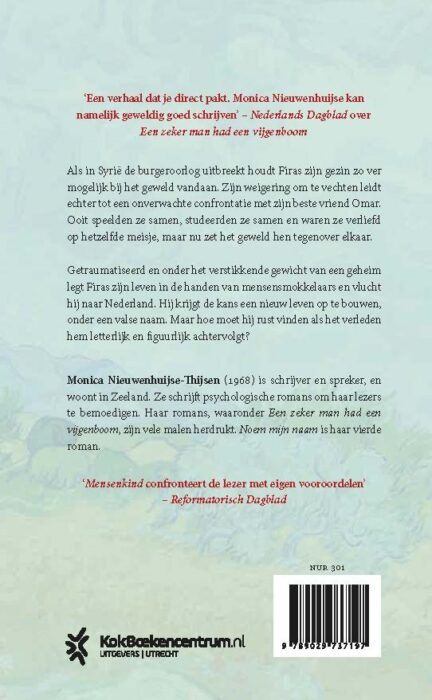 In ‘Noem mijn naam’ van Monica Nieuwenhuijse houdt Firas als de burgeroorlog uitbreekt in Syrië zijn gezin zo ver mogelijk bij het geweld vandaan. Zijn weigering om te vechten leidt echter tot een onverwachte confrontatie met zijn beste vriend Omar. Ooit speelden ze samen, studeerden ze samen en waren ze verliefd op hetzelfde meisje, maar nu zet het geweld hen tegenover elkaar. Getraumatiseerd en onder het verstikkende gewicht van een geheim, legt Firas zijn leven in de handen van mensensmokkelaars en vlucht hij naar Nederland. Hij krijgt de kans een nieuw leven op te bouwen, onder een valse naam. Maar hoe moet hij rust vinden als het verleden hem letterlijk en figuurlijk achtervolgt?