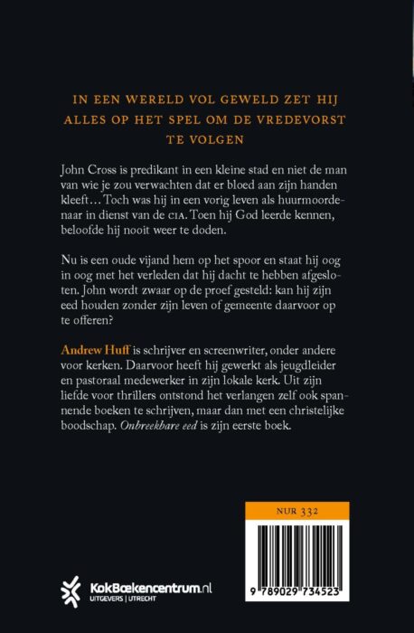 In ‘Onbreekbare eed’ van Andrew Huff leidt predikant John Cross zijn gemeente op het goede pad. Hij is niet iemand van wie je verwacht dat hij een duister verleden heeft, maar de waarheid is dat hij in een vorig leven in dienst was van de CIA. Toen John zich bekeerde tot God, heeft hij zijn oude leven achter zich gelaten, maar nu is een oude vijand hem op het spoor die hem voor zijn zonden wil laten betalen met zijn leven. Kan John zich aan zijn eed houden en het probleem oplossen zonder dat er bloed wordt vergoten? Kan hij zijn gemeente en zichzelf beschermen? Als het erop aankomt, is zijn leven misschien wel het enige wat hij nog heeft om op te offeren…