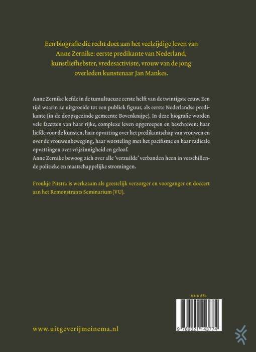 Een biografie die recht doet aan het veelzijdige leven van Anne Zernike: eerste predikante van Nederland, kunstliefhebster, vredesactiviste, vrouw van de jong overleden kunstenaar Jan Mankes.