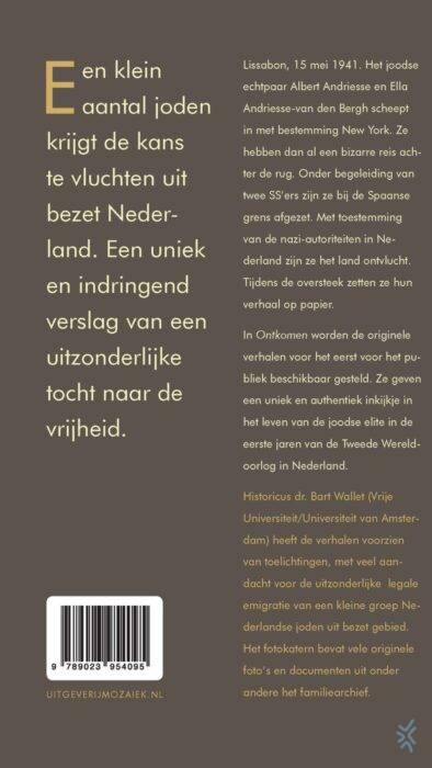 'Ontkomen' is het vluchtverhaal van het joodse echtpaar Albert en Ella Andriesse-van den Bergh uit 1940-1941, bezorgd door historicus dr. Bart Wallet. Deze authentieke documenten - decennialang alleen in familiekring bekend - geven een uniek inkijkje in het leven van de Nederlands-joodse elite in de eerste jaren van de Tweede Wereldoorlog. De tekst is voorzien van een inleiding en toelichtende teksten, met veel aandacht voor de uitzonderlijke legale emigratie van een kleine groep Nederlandse joden uit bezet gebied. Het fotokatern bevat vele originele foto’s en documenten uit onder andere het familiearchief.