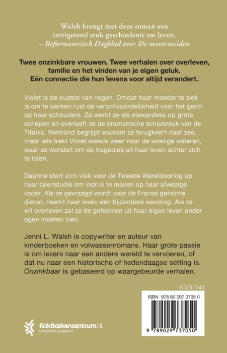 Omdat haar moeder te ziek is om te werken rust de verantwoordelijkheid voor het gezin op de schouders van Violet, de oudste van negen. Zo werkt ze als stewardess op grote schepen en overleeft ze de dramatische schipbreuk van de Titanic. Tijdens de Eerste Wereldoorlog werkt ze als verpleegster en helpt ze mannen die haar broers hadden kunnen zijn. Daphne stort zich vlak voor de Tweede Wereldoorlog op haar talenstudie om indruk te maken op haar afwezige vader. Als ze gevraagd wordt voor de Franse geheime dienst, neemt haar leven een bijzondere wending. Als ze wil overleven zal ze de geheimen uit haar eigen leven onder ogen moeten zien. ‘Onzinkbaar’ van Jenni L. Walsh is gebaseerd op het waargebeurde verhaal van Violet Jessop, die drie scheepsrampen overleefde en op het verhaal van de negenendertig vrouwen van de Special Operations Executive.