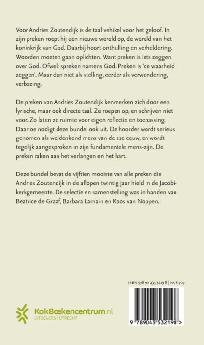 ‘Oplichtende woorden’ is een bundeling van de vijftien mooiste preken van Andries Zoutendijk. In zijn preken roept Andries Zoutendijk een nieuwe wereld op, de wereld van het koninkrijk van God. Zijn preken kenmerken zich door een lyrische, maar ook directe taal. Ze roepen op, en schrijven niet voor. Zo laten ze ruimte voor eigen reflectie en toepassing. De hoorder wordt serieus genomen als weldenkend mens van de 21e eeuw, en wordt tegelijk aangesproken in zijn fundamentele mens-zijn. Twintig jaar was Andries Zoutendijk predikant van de Jacobikerk in Utrecht. De redactie, bestaande uit Beatrice de Graaf, Barbara Lamain en Koos van Noppen, heeft een selectie gemaakt van de mooiste vijftien preken uit die periode, en die bewerkt tot meditaties om zelf te lezen of met elkaar te bespreken.