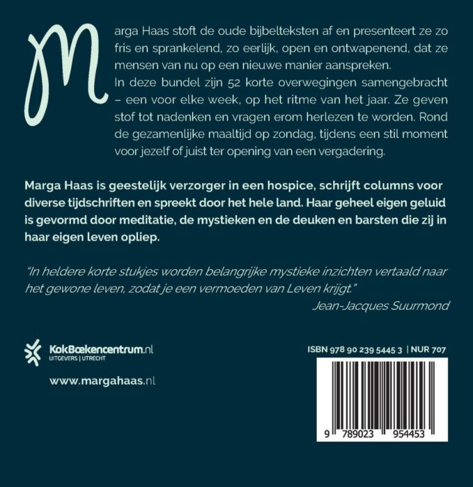 Marga Haas (Middelburg) studeerde theologie en is geestelijk verzorger in een hospice. Ze geeft bezinningscursussen over o.a. Meester Eckhart en publiceert elke twee weken een korte overweging waarin bijbelteksten en mystiek samenkomen. Zie www.margahaas.nl.