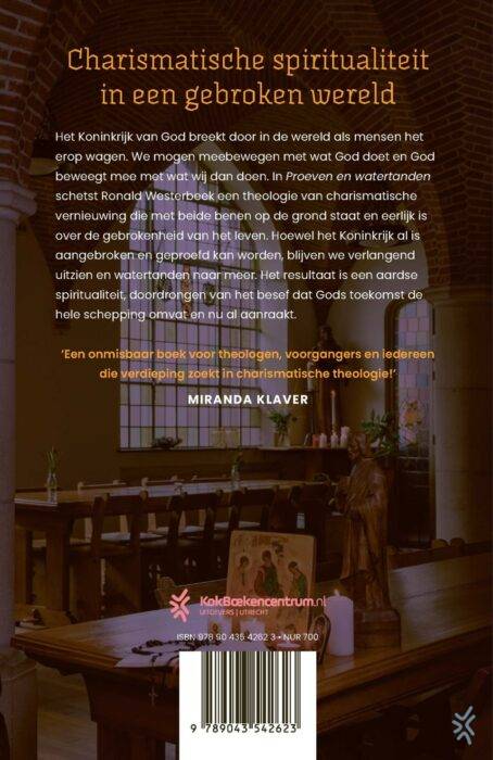 In ‘Proeven en watertanden’ schetst theoloog Ronald Westerbeek een theologie van charismatische vernieuwing die met beide benen op de grond staat en eerlijk is over de gebrokenheid van het leven. Het Koninkrijk van God breekt door in de wereld als mensen het erop wagen. We mogen meebewegen met wat God doet en God beweegt mee met wat wij dan doen. Hoewel het Koninkrijk al is aangebroken en geproefd kan worden, blijven we verlangend uitzien en watertanden naar meer. Het resultaat is een aardse spiritualiteit, doordrongen van het besef dat Gods toekomst de hele schepping omvat en nu al aanraakt.