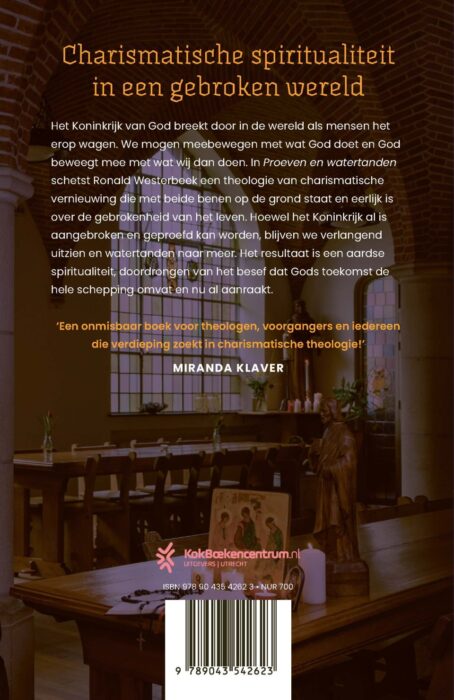 In ‘Proeven en watertanden’ schetst theoloog Ronald Westerbeek een theologie van charismatische vernieuwing die met beide benen op de grond staat en eerlijk is over de gebrokenheid van het leven. Het Koninkrijk van God breekt door in de wereld als mensen het erop wagen. We mogen meebewegen met wat God doet en God beweegt mee met wat wij dan doen. Hoewel het Koninkrijk al is aangebroken en geproefd kan worden, blijven we verlangend uitzien en watertanden naar meer. Het resultaat is een aardse spiritualiteit, doordrongen van het besef dat Gods toekomst de hele schepping omvat en nu al aanraakt.