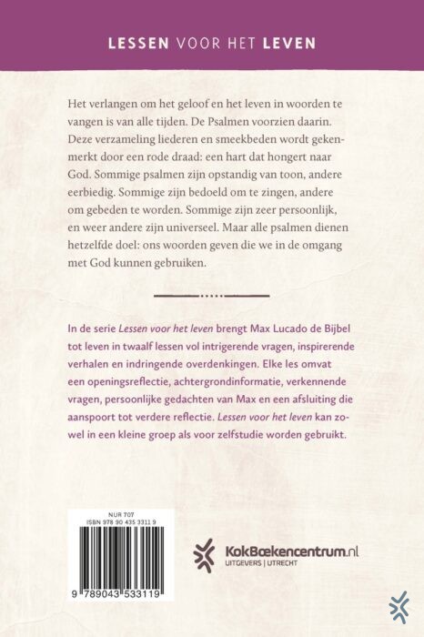 ‘Lessen voor het leven’ is een serie Bijbelstudies van Max Lucado, waarin de auteur telkens in twaalf hoofdstukken een Bijbelboek uit het Oude Testament uitdiept. In Psalmen onderzoekt Lucado de liederen die al eeuwenlang gebeden en gezongen worden. Geschikt voor zelfstandig gebruik of in groepen.