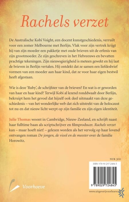 In de roman ‘Rachels verzet’ van Julie Thomas staat een jonge vrouw vlak voor de Tweede Wereldoorlog haar baby af. Voor de fans van ‘Haar naam was Sarah’ van Tatiana de Rosnay. Dr. Jakob (Kobi) Voight is kunstenaar en doceert kunstgeschiedenis aan de Universiteit van Melbourne. Hij besluit een sabbatical te nemen van drie maanden en naar Duitsland te reizen. Vlak voor zijn vertrek krijgt hij van zijn moeder een dagboek dat zij heeft gevonden tussen de spullen van zijn overleden oma. Het is geschreven in het Hebreeuws en bevat prachtige pentekeningen. Als Kobi in Berlijn is, neemt hij het dagboek mee naar een synagoge en vraagt daar aan een geleerde die veel weet over de Shoah om het te vertalen. Terwijl hij ronddwaalt in de stad leest hij het boek en ontdekt dat het een liefdesbrief is van een moeder aan haar buitenechtelijke kind dat werd geboren in 1942. Tijdens het lezen realiseert hij zich dat hij deel uitmaakt van een ingewikkeld web dat zich uitstrekt van de tijd van de holocaust tot nu en dat nieuw licht werpt op al zijn overtuigingen. ‘Rachels verzet’ onthult meer van de schrijnende geschiedenis van de familie Horowitz. Het is een los te lezen vervolg op ‘De jongen, de viool en de meester’.