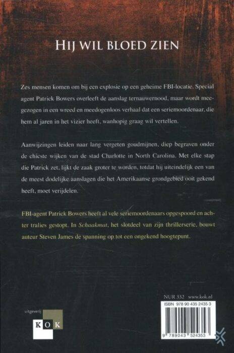 'Schaakmat' is het slot van Steven James' bloedstollende serie over FBI-agent Patrick Bowers. Wanneer er een aanslag plaatsvindt op een geheime FBI-locatie, wordt special agent Patrick Bowers meegezogen in een wreed en meedogenloos verhaal dat een seriemoordenaar die hem al jaren in het vizier heeft wanhopig graag wil vertellen. Aanwijzingen leiden naar lang vergeten geheimen, diep begraven onder de chicste wijken van de stad Charlotte in North Carolina. Met elke stap die Patrick zet, lijkt de zaak groter te worden, totdat hij uiteindelijk een van de meest dodelijke aanslagen die het Amerikaanse grondgebied ooit gekend heeft, moet verijdelen.