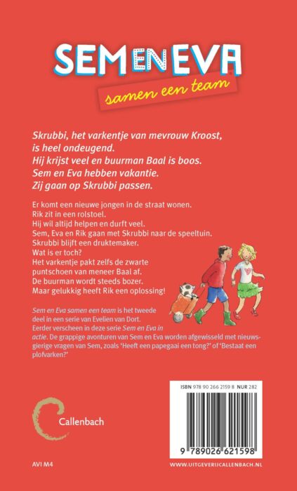 ‘Sem en Eva samen een team’ van Evelien van Dort is een boek op AVI 4 niveau. Eerder verscheen in deze serie ‘Sem en Eva in actie’. Rik komt bij Sem en Eva in de straat wonen, hij zit in een rolstoel. Sem, Eva en Rik schrijven zich als team in voor het Zomerspel. Het ondeugende varkentje Skrubbi is van de partij en zorgt voor grappige voorvallen. Een ontroerend verhaal over vriendschap, leven met een handicap en doorzetten. Van Dort is onder andere bekend van haar boekenserie over het paard Funny.