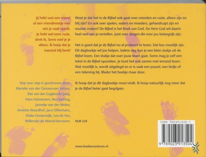 Jij hebt vast een vriend of een vriendinnetje met wie je vaak speelt. Je hebt wel eens ruzie, denk ik. Soms voel je je alleen. Ik hoop dat je meestal blij bent! Weet je dat het in de Bijbel ook gaat over vrienden en ruzie, alleen zijn en blij zijn? En ook over spelen, vaders en moeders, gehandicapt zijn en muziek maken? De Bijbel is het Boek van God. De Here God wil daarin heel veel aan je vertellen. Juist over dingen die voor jou belangrijk zijn. Het is goed dat je de Bijbel nu al probeert te lezen. Dat kan moeilijk zijn. Dit dagboekje wil jou helpen. Iedere dag kun je een klein stukje uit de Bijbel lezen. Een stukje dat over jouw leven gaat. Soms mag je zelf een tekst in de Bijbel opzoeken. Je kunt het ook samen met iemand lezen. Wat moeilijk is, wordt uitgelegd en er is vaak een puzzel, een liedje of een tekening bij. Blader het boekje maar door. Ik hoop dat je dit dagboekje mooi vindt. Ik hoop natuurlijk nog meer dat je de Bijbel beter gaat begrijpen. 'Stap voor stap' is geschreven door: Marieke van der Giessen-van Velzen, Site van der Gugten-de Jong, Hans Hannessen, Ben Ketting, Janneke van der Molen, Annette Noordhof, Jaco Offermans, Dieke Oosterwijk, Leo de Vos, Willemijn de Weerd-Vervoorn