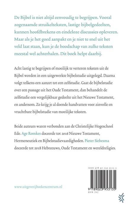 De Bijbel is niet altijd eenvoudig te begrijpen. Vooral de zogenaamde struikelteksten, de lastige bijbelgedeelten, kunnen hoofdbrekens en eindeloze discussies opleveren. Maar als je het goed aanpakt en je niet te snel uit het veld laat staan, kun je de boodschap van lastige teksten meestal wel achterhalen. Dit boek helpt daarbij. Acht teksten uit het Oude Testament worden in een uitgewerkte bijbelstudie uitgelegd. Daarna volgt telkens aanzet tot een zelfstudie over een vergelijkbare tekst uit het Nieuwe Testament. Al doende krijg je handvatten voor zinvolle en vruchtbare bijbelstudie van moeilijke teksten