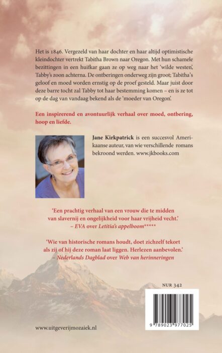 Het is 1846. Vergezeld van haar dochter en haar altijd optimistische kleindochter vertrekt Tabitha Brown naar Oregon. Met hun schamele bezittingen in een huifkar gaan ze op weg naar het 'Wilde Westen', Tabby's zoon achterna. De ontberingen onderweg zijn groot; Tabitha's geloof en moed worden ernstig op de proef gesteld. Maar juist door deze barre tocht zal Tabby tot haar bestemming komen - en is ze tot op de dag van vandaag bekend als de 'moeder van Oregon'. Met haar kenmerkende aandacht voor detail vertelt Jane Kirkpatrick een inspirerend en avontuurlijk verhaal.
