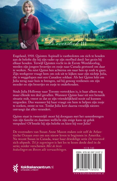 'Tel je zegeningen' van Susan Anne Mason begint in Engeland, in 1918. Quinten Aspinall is vastbesloten om zich te houden aan de belofte die hij zijn vader op zijn sterfbed deed: dat hij het gezin bij elkaar zou houden. Terwijl Quinten vocht in de Eerste Wereldoorlog, werden zijn jongere broertjes en zusjes naar Canada gestuurd om daar te werken. Nu reist Quinten naar Canada om hen te zoeken. Zijn werkgever vraagt hem om ook uit te kijken naar zijn nichtje Julia, die is weggelopen met een Canadese soldaat. Als het Quinn lukt om Julia terug naar huis te brengen, zal hij genoeg verdienen om zijn moeder en zijn broertjes en zusjes te onderhouden.
