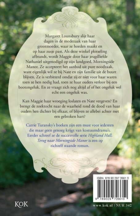 In 'Terug naar Morningside Manor' van Carrie Turansky slijt de ijverige Margaret Lounsbury haar dagen in de modezaak van haar grootmoeder, waar ze hoeden maakt en op haar zusje past. Haar dromen voor de toekomst is ze kwijtgeraakt toen ze een aantal jaren geleden haar ouders bij een bootongeluk verloor. Ondanks alles toont ze veel veerkracht, maar die zwarte dag bij het meer blijft haar achtervolgen. Want wat als het ongeluk geen ongeluk was?