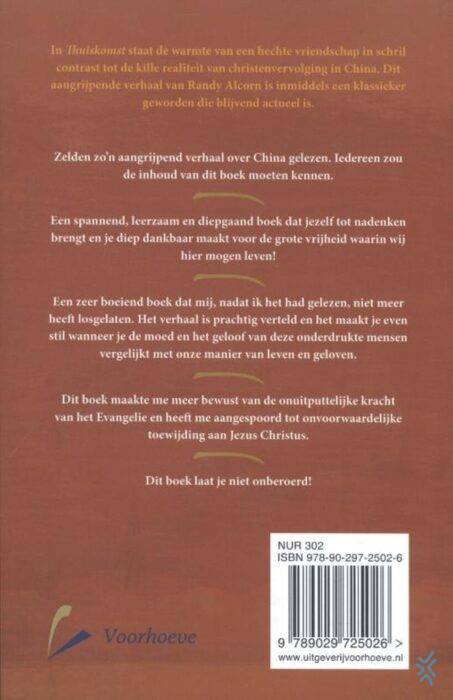 ‘Thuiskomst’ van Randy Alcorn is een aangrijpend verhaal over christenvervolging. In hun studietijd waren de Amerikaan Ben Fielding en de Chinees Li Quan hechte vrienden. Maar nu, twintig jaar later, zijn ze elkaar uit het oog verloren. Als Ben naar China reist om Li op te zoeken, heeft hij geen idee van de schokkende ontdekkingen die hem daar te wachten staan. Bijeengebracht in een uur van naderende duisternis, moeten Ben en Li keuzes maken. Keuzes die niet alleen het lot zullen bepalen van twee mannen, maar ook van twee gezinnen, twee landen – twee werelden. Het wordt een ontmoeting om nooit meer te vergeten. Randy Alcorn is de auteur van meer dan dertig boeken, onder andere ‘Deadline’ en ‘Moedig’. Voor de bestseller ‘Thuiskomst’ ontving hij in 2003 een Gold Medallion Award.