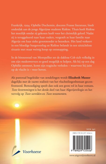 De historische roman ‘Twee bestemmingen’ van Elizabeth Musser is het derde en laatste deel in haar serie over de Algerijnse Onafhankelijkheidsoorlog. Eerder verschenen ‘Twee werelden’ en ‘Twee testamenten’. Frankrijk, 1994. Ophélie Duchemin, docente Franse literatuur, geeft onderdak aan de jonge Algerijnse studente Rislène. Thuis heeft Rislène het moeilijk omdat zij gekozen heeft voor het christelijk geloof. Nadat zij is teruggekeerd naar haar ouders, vergezelt Rislène haar familie naar Algerije om haar zieke grootmoeder te bezoeken. Het land verkeert in een bloedige burgeroorlog en Rislène belandt in een uitzichtloze situatie met maar weinig hoop op ontsnapping. In de binnenstad van Montpellier zet de dakloze Ceb zich volledig in om zijn medezwervers zo goed mogelijk te helpen. Als hij op een dag Ophélie ontmoet, komt zijn tragische verleden – waarvoor hij juist op de vlucht is – weer boven.