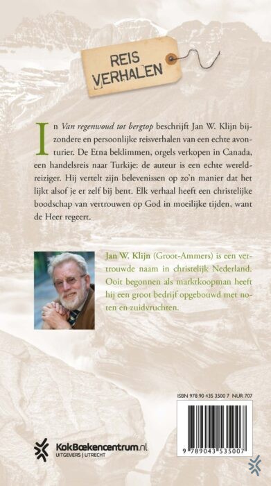 In Van regenwoud tot bergtop beschrijft Jan W. Klijn bijzondere en persoonlijke reisverhalen van een echte avonturier. De Etna beklimmen, orgels verkopen in Canada, een handelsreis naar Turkije: de auteur is een echte wereldreiziger. Hij vertelt zijn belevenissen op zo’n manier dat het lijkt alsof je er zelf bij bent. Elk verhaal heeft een christelijke boodschap van vertrouwen op God in moeilijke tijden.
