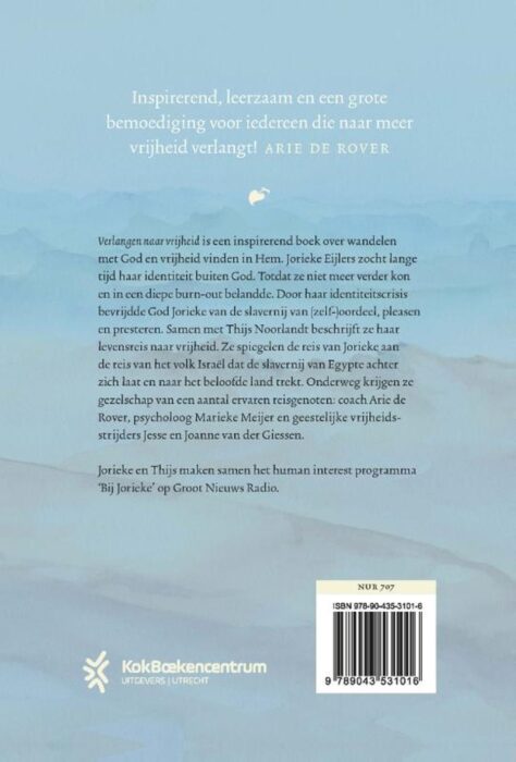 ‘Verlangen naar vrijheid’ is een inspirerend boek over wandelen met God en vrijheid vinden in Hem. Jorieke Eijlers-Fredrikze zocht lange tijd haar identiteit buiten God. Totdat ze niet meer verder kon en in een diepe burn-out belandde. Maar God bevrijdde haar van de slavernij van (zelf-)oordeel, pleasen en presteren. Samen met haar programma-redacteur Thijs Noorlandt beschrijft ze haar levensreis naar vrijheid, afgewisseld met de reis van het volk Israël naar het beloofde land. Met veel quotes van reisgenoten als Arie de Rover en psycholoog Marieke Meijer, bemoedigende verhalen en fun facts.