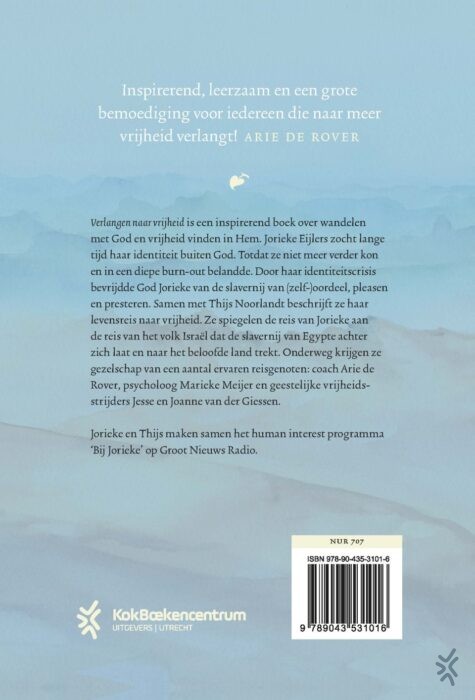 ‘Verlangen naar vrijheid’ is een inspirerend boek over wandelen met God en vrijheid vinden in Hem. Jorieke Eijlers-Fredrikze zocht lange tijd haar identiteit buiten God. Totdat ze niet meer verder kon en in een diepe burn-out belandde. Maar God bevrijdde haar van de slavernij van (zelf-)oordeel, pleasen en presteren. Samen met haar programma-redacteur Thijs Noorlandt beschrijft ze haar levensreis naar vrijheid, afgewisseld met de reis van het volk Israël naar het beloofde land. Met veel quotes van reisgenoten als Arie de Rover en psycholoog Marieke Meijer, bemoedigende verhalen en fun facts.