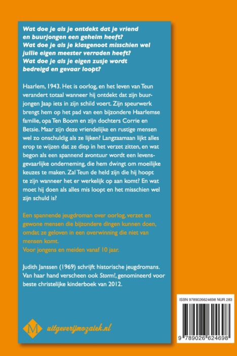 Wat doe je als je ontdekt dat je vriend en buurjongen een geheim heeft? Wat doe je als je klasgenoot misschien wel jullie eigen meester verraden heeft? Wat doe je als je eigen zusje wordt bedreigd en gevaar loopt? Haarlem, 1943. Het is oorlog, en het leven van Teun verandert totaal wanneer hij ontdekt dat zijn buurjongen Jaap iets in zijn schild voert. Zijn speurwerk brengt hem op het pad van een bijzondere Haarlemse familie, opa Ten Boom en zijn dochters Corrie en Betsie. Maar zijn deze vriendelijke en rustige mensen wel zo onschuldig als ze lijken? Langzaamaan lijkt alles erop te wijzen dat ze diep in het verzet zitten, en wat begon als een spannend avontuur wordt een levensgevaarlijke onderneming, die hem dwingt om moeilijke keuzes te maken. Zal Teun de held zijn die hij hoopt te zijn wanneer het er werkelijk op aan komt? En wat moet hij doen als alles mis loopt en het misschien wel zijn schuld is? Voor jongens en meiden vanaf 10 jaar.