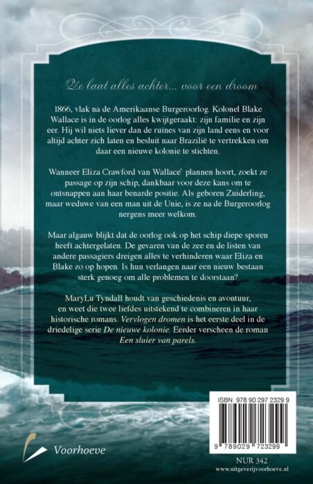 "Vervlogen dromen" van MaryLu Tyndall speelt zich af vlak na de Amerikaanse Burgeroorlog. Het land ligt in puin en vele mensen zijn hun leven niet zeker. Een van die mensen is Eliza Crafword. Als ze hoort dat ene kolonel Blake Wallace naar Brazilië vertrekt om daar een nieuwe kolonie te stichten, zoekt ze passage op zijn schip. Als geboren Zuiderling, maar weduwe van een man uit de Unie, is ze na de Burgeroorlog nergens meer welkom. Maar algauw blijkt dat de oorlog ook op hun schip diepe sporen heeft achtergelaten. De gevaren van de zee en de listen van andere passagiers dreigen alles te verhinderen waar Eliza en Blake zo op hopen. MaryLu Tyndall debuteerde met de historische roman `Een sluier van parels , over een slavin die ontsnapt en een nieuw leven opbouwt.