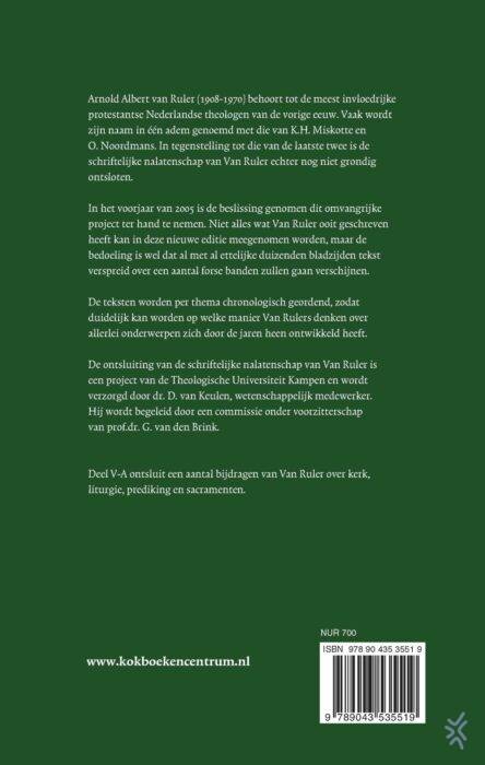 Verzameld Werk V-C van A.A. van Ruler is een verzameling van Rulers teksten, die licht werpt op dogmatische thema’s en de Nederlandse Hervormde Kerk. De twintigste eeuw is zowel in de theologie als in de Nederlandse Hervormde Kerk een bewogen tijd geweest. Onder invloed van gebeurtenissen in de wereldgeschiedenis kwam er veel in beweging. Dat is zichtbaar in de teksten die zijn bijeengebracht in dit deel van het Verzameld Werk van Van Ruler. We leren Van Ruler niet alleen kennen als dogmaticus die nadenkt over thema’s als de belijdenis en de leer van de laatste dingen, maar ook als zendings- en apostolaatstheoloog, als denker betrokken op de wereld en als kerkelijk leider met een geheel eigen visie.
