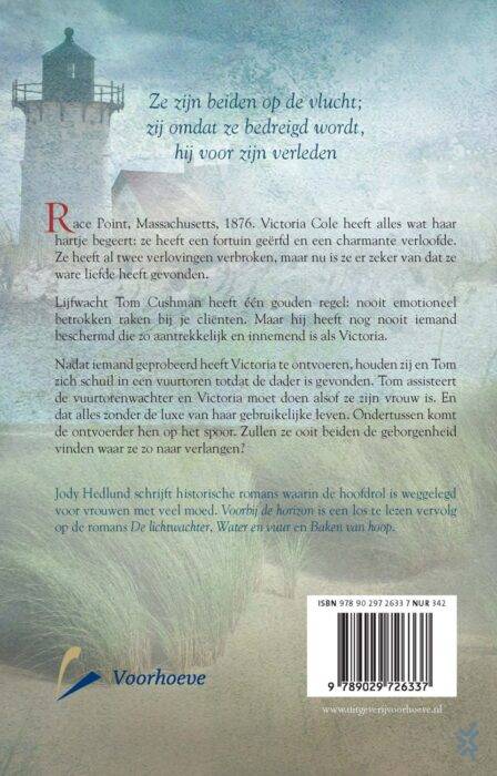 ‘Voorbij de horizon’ is het vierde en laatste deel van Jody Hedlunds serie rond vuurtorens. Race Point, Massachusetts, 1876. Victoria Cole heeft alles wat haar hartje begeert: ze heeft een fortuin geërfd en een charmante verloofde. Ze heeft al twee verloofdes versleten, maar nu is ze er zeker van dat ze ware liefde heeft gevonden. Als de bruiloft nadert, wordt Victoria bedreigd. Haar vader huurt haar vader een man in om haar te beschermen. Lijfwacht Tom Cushman heeft één gouden regel: nooit emotioneel betrokken raken bij je cliënten. Maar hij heeft nog nooit iemand beschermd die zo aantrekkelijk en innemend is als Victoria. Na een poging tot ontvoering, wordt de bruiloft uitgesteld en houden Tom en Victoria zich schuil in een vuurtoren totdat de dader is gevonden. Tom assisteert de vuurtorenwachter en Victoria moet doen alsof ze zijn vrouw is. En dat alles zonder de luxe van haar gebruikelijke leven. Als ze Tom beter leert kennen en hem helpt om zijn verleden achter zich te laten, moet ze ook haar eigen angsten onder ogen zien. Ondertussen komt de ontvoerder hen op het spoor. Zullen ze ooit beiden stoppen met vluchten en de geborgenheid vinden waar ze zo naar verlangen?