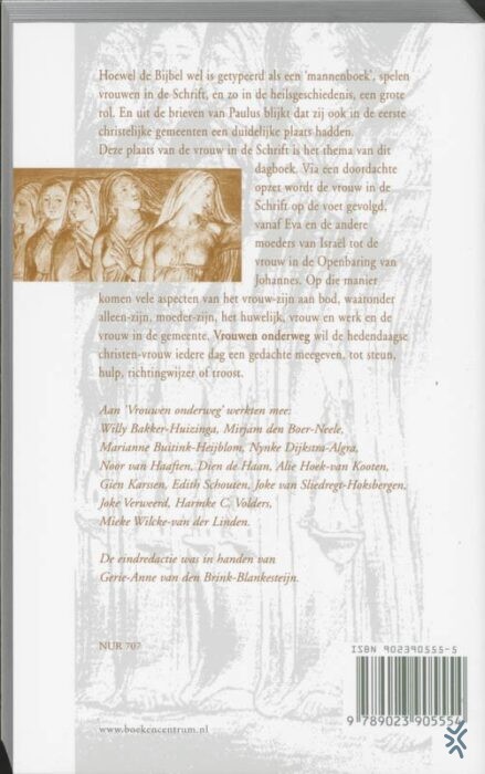 Hoewel de Bijbel wel is getypeerd als een 'mannenboek', spelen vrouwen in de Schrift, en zo in de heilsgeschiedenis, een grote rol. En uit de brieven van Paulus blijkt dat zij ook in de eerste christelijke gemeenten een duidelijke plaats hadden. Deze plaats van de vrouw in de Schrift is het thema van dit dagboek. Via een doordachte opzet wordt de vrouw in de Schrift op de voet gevolgd, vanaf Eva en de andere moeders van Israël tot de vrouw in de Openbaring van Johannes. Op die manier komen vele aspecten van het vrouw-zijn aan bod, waaronder alleen-zijn, moeder-zijn, het huwelijk, vrouw en werk en de vrouw in de gemeente. Vrouwen onderweg wil de hedendaagse christen-vrouw iedere dag een gedachte meegeven, tot steun, hulp, richtingwijzer of troost.