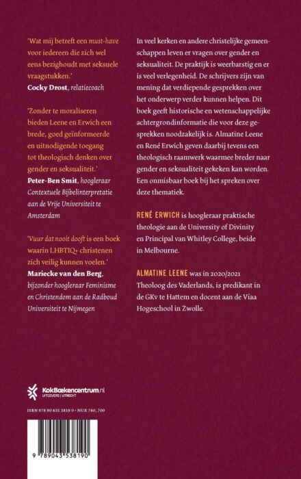 Vuur dat nooit dooft van René Erwich en Almatine Leene is een onmisbaar theologisch boek over gender en seksualiteit in de kerk. In veel kerken en andere christelijke gemeenschappen leven er vragen over gender en seksualiteit. De praktijk is weerbarstig en er is veel verlegenheid. Ook is er vaak weinig ruimte om dieper op het onderwerp in te gaan en zijn gesprekken vaak eenzijdig. Dit boek geeft de achtergrondinformatie die voor een goed gesprek nodig is. De auteurs geven een theologisch raamwerk waarmee met een bredere bril naar de vragen rond gender en seksualiteit gekeken kan worden. Een onmisbaar boek bij het spreken over deze actuele thematiek.