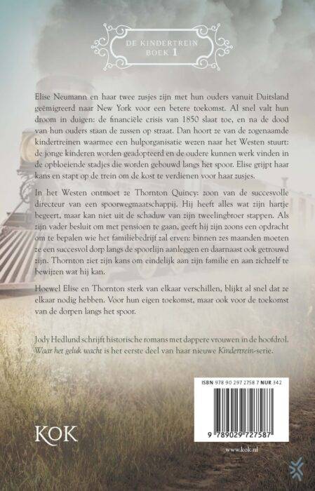 Met de ontroerende historische roman ‘Waar het geluk wacht’ werpt Jody Hedlund een licht op de verschrikkelijke omstandigheden van vrouwen in zowel het New York van eind 19e eeuw en het zich ontwikkelende Westen van de Verenigde Staten. Elise Neumann en haar twee zusjes hebben hun ouders verloren en staan op straat. Ze hebben geen idee hoe ze moeten overleven in het door een grote financiële crisis geraakte New York van 1850. Dan hoort Elise van de zogenaamde ‘orphan trains’, de kindertreinen waarmee een hulporganisatie wezen naar het Westen stuurt: de jonge kinderen worden geadopteerd en de oudere kunnen werk vinden in de nieuwe stadjes die worden gebouwd langs het spoor. Elise voelt er niets voor om haar zusjes in de steek te laten, maar ze ziet geen andere uitweg en stapt op de trein. ‘Waar het geluk wacht’ is het eerste deel in de serie ‘De kindertrein’.
