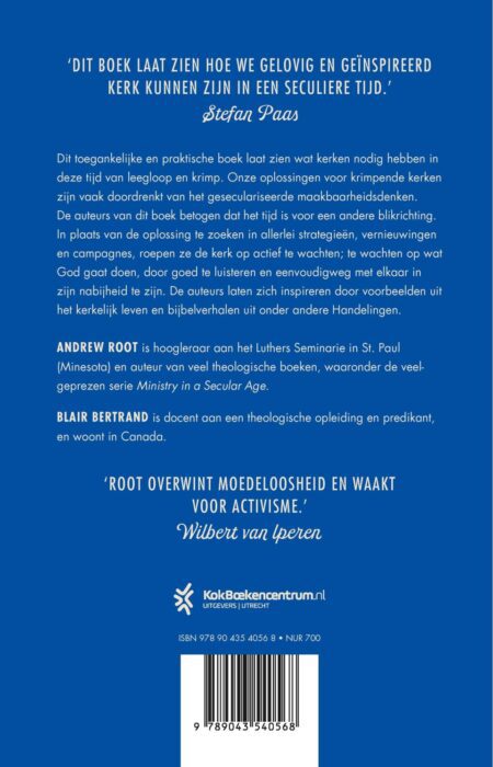 Wachten op God van hoogleraar theologie Andrew Root en docent theologie Blair Bertrand zet in toegankelijke taal uiteen wat kerken nodig hebben in deze tijd van leegloop en krimp. Daarbij nemen ze afstand van het maakbaarheidsdenken. In plaats van de oplossing te zoeken in allerlei strategieën, vernieuwingen en campagnes, roepen ze de kerk op te wachten: wachten op wat God gaat doen. Ze geven aan dat onze oplossingen voor krimpende kerken zijn doordrenkt van het geseculariseerde denken. Het is tijd voor een andere blikrichting. De auteurs laten zich inspireren door voorbeelden uit het kerkelijk leven en Bijbelverhalen uit onder andere Handelingen.