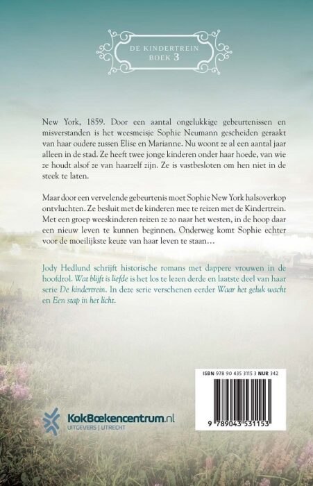 ‘Wat blijft is liefde’ is het derde en laatste deel van de serie ‘De kindertrein’. Eerder verschenen in deze serie van Jody Hedlund ‘Waar het geluk wacht’ en ‘Een stap in het licht’.