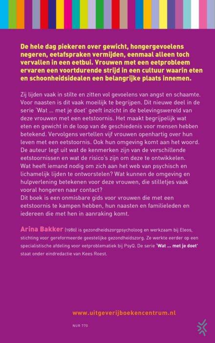 Zij lijden vaak in stilte en zitten vol gevoelens van angst en schaamte. Voor naasten is dit vaak moeilijk te begrijpen. Dit nieuwe deel in de serie `Wat met je doet geeft inzicht in de belevingswereld van deze vrouwen met een eetstoornis. Het maakt begrijpelijk wat eten en gewicht in de loop van de geschiedenis voor mensen hebben betekend. Vervolgens vertellen vijf vrouwen openhartig over hun leven met een eetstoornis. Ook hun omgeving komt aan het woord.