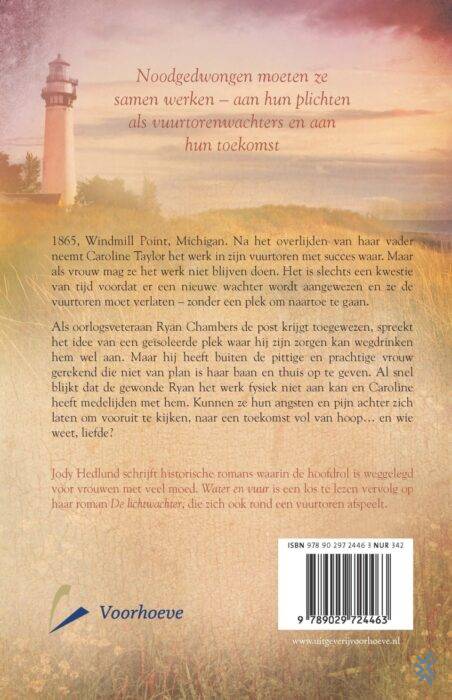 De romans van Jody Hedlund kenmerken zich door mix van historie en romantiek, met een vleugje mysterie. ‘Water en vuur’ is een los te lezen op haar roman ‘De lichtwachter’, die zich ook rond een vuurtoren afspeelt.