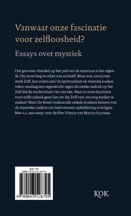 ‘Zelfloos’ is een gevarieerde bundel essays over mystiek in deze tijd van de hand van de filosoof Marc De Kesel. Het grootste obstakel op het pad van de mysticus is het eigen Ik. Hij moet leeg worden van zichzelf. Maar wie, tenzij een sterk Zelf, kan zoiets aan? In spiritualiteit en mystiek zoeken velen vandaag een tegenwicht tegen de sterke nadruk op het Zelf die de moderniteit van ons eist. Maar is onze fascinatie voor zelfloosheid geen list om dat Zelf van ons nog sterker te maken? Marc De Kesel onderzoekt enkele donkere kamers van de mystieke traditie om hieromtrent opheldering te krijgen. Met o.a. een essay over de film ‘Silence’van Martin Scorsese. Een boek voor zinzoekers die zich willen bevrijden uit conceptuele kaders en starre dogma’s.