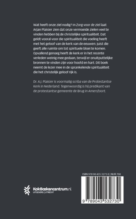 Zorg voor de ziel van Arjan Plaisier biedt inspiratie voor spiritueel leven vanuit de christelijke traditie. Is de ziel terug van weggeweest? Feit is dat in deze tijden waarin het bezield verband ontbreekt, veel mensen zoeken naar een vorm van spiritualiteit. Opvallend genoeg doen christelijk geloof en kerk daarin veelal niet mee. De christelijke traditie is echter bij uitstek spiritueel. Hier zijn onuitputtelijke bronnen te vinden voor hoofd en hart. Dit boek is bestemd voor ieder – binnen en buiten de kerk – die de zorg voor de eigen ziel serieus wil nemen en behoefte heeft aan verdieping en verbreding.